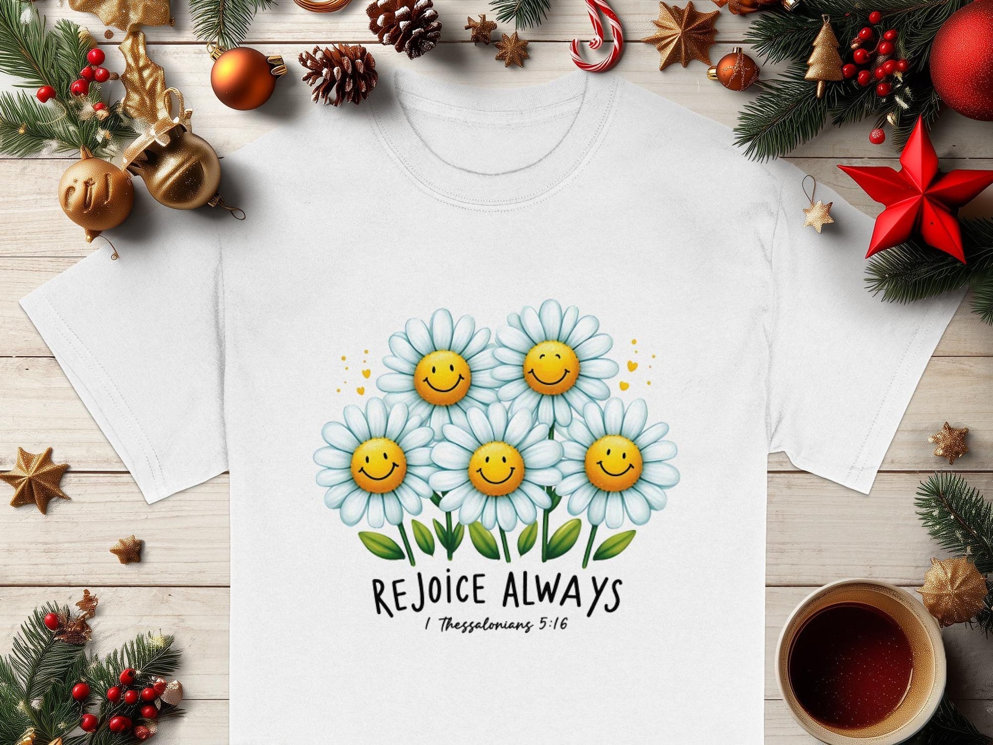 Rejoice Always T-Shirt, Daisy Smile Tee, Christian Verse Shirt, Inspirational Graphic T-Shirt, Floral Happiness Gift